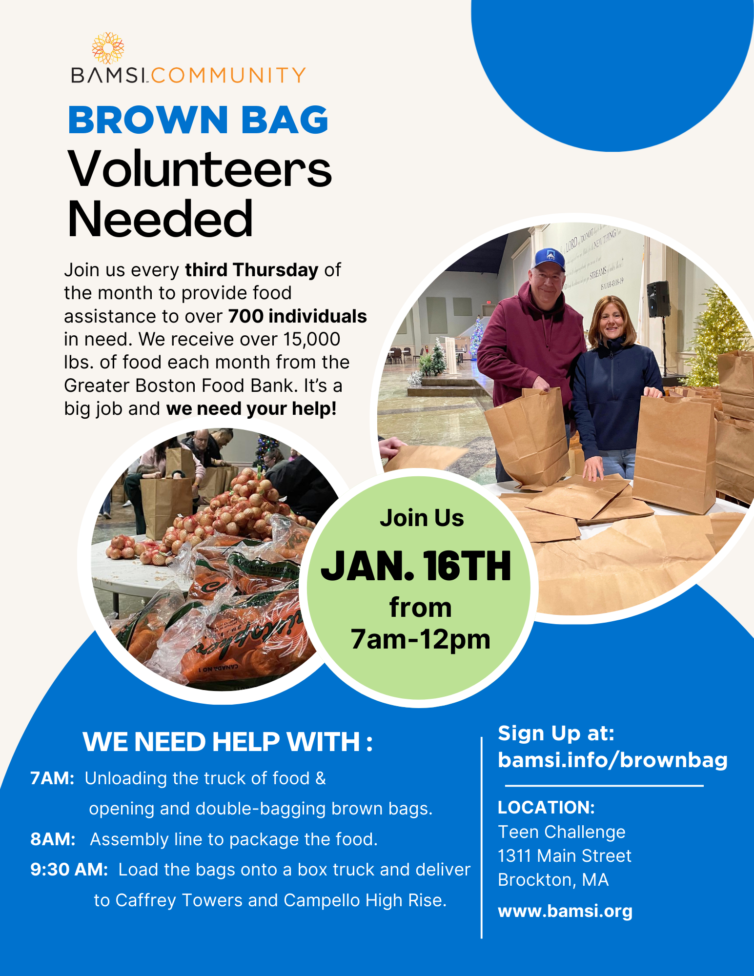 Join us every third Thursday of the month to provide food assistance to over 700 individuals in need. We receive over 15,000 lbs. of food each month from the Greater Boston Food Bank. It’s a big job and we need your help! Sign up at: bamsi.info/brownbag 7AM: Unloading the truck of food & opening and […]